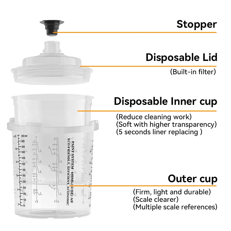 従来の1.0シリーズと比較して、AYS3.1使い捨てスプレーガンカップは、追加のカットアウトウィンドウを備えた改良されたアウターカップデザインを備えており、噴霧器がカップ内の塗料を簡単に監視できるようにします。統合されたロック設計により、カップの変更が簡素化され、スプレー効率が大幅に向上します。