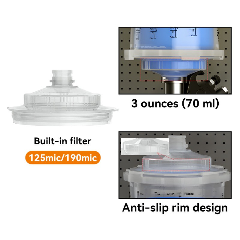-AYS3.1スプレーカップの蓋は、フィルターの下に最大3オンスの塗料を保持する二重層構造を備えています。蓋は、塗料の流れと一貫性を改善しながら、スプラッタを最初から最後まで減らします。
