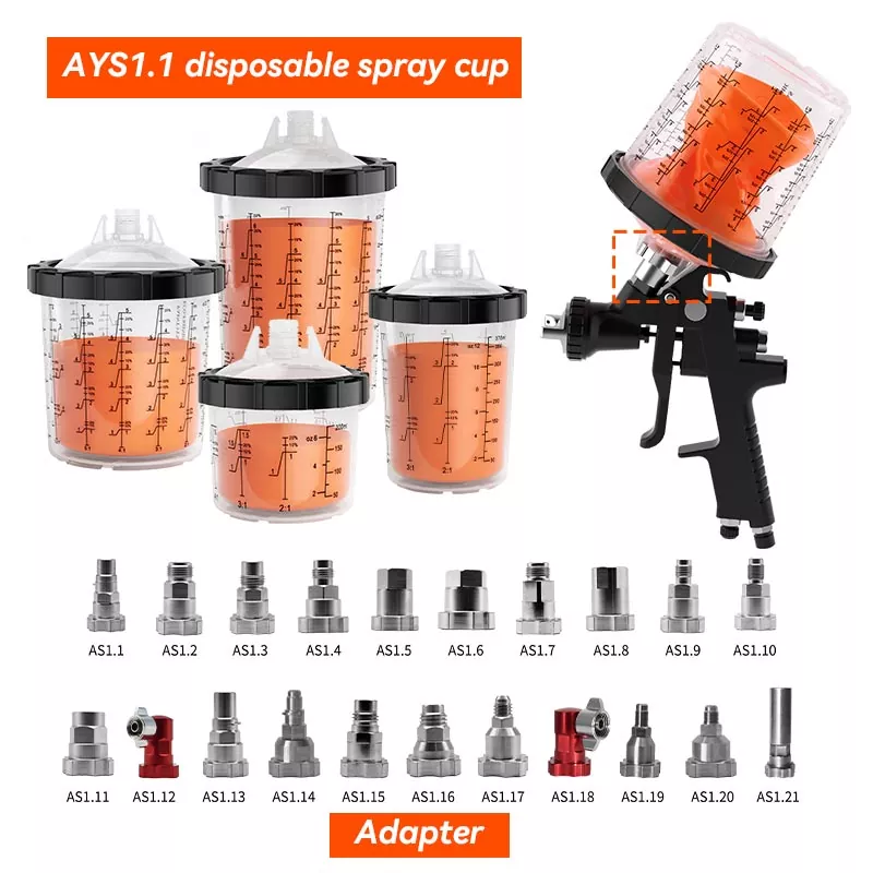 AYS1.1 使い捨てスプレーカップは、PPS1.0 シリーズアダプターと互換性があります。アダプターを使用すると、あらゆるブランドのスプレーガンに完全に適合し、塗料が垂れる危険がなく、どの位置でも使用できます。