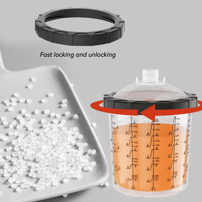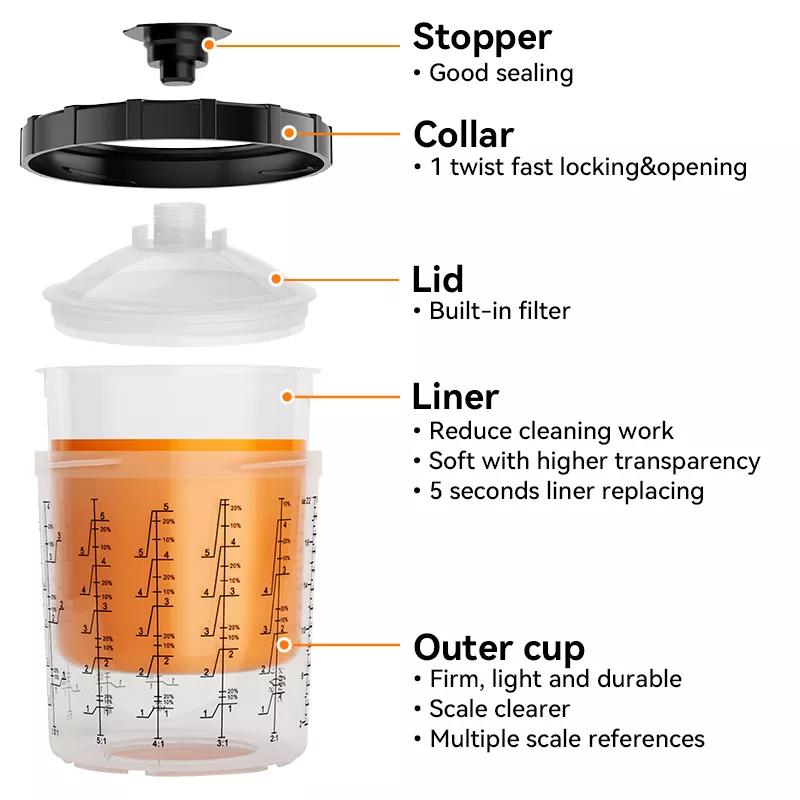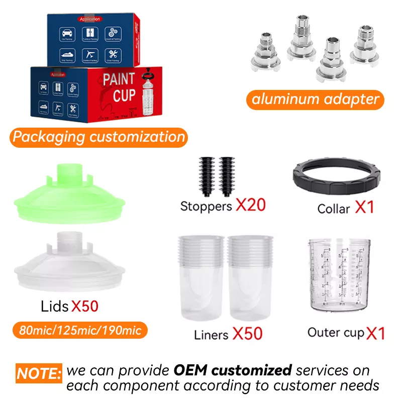 850ML スピーディペイントシステム 2.0 は主に、プラグ、蓋、カラー、ライナー、アウターカップの 5 つのパーツで構成されています。このうち、インナーがPE製であることを除き、残りは主にPP製です。ライナーは非常に柔らかく、取り外しや交換が簡単です。他の部分はしっかりしていて非常に耐久性があります。使い捨て塗料カップシステムの出現により、従来の重力供給カップシステムを完全に置き換えることができ、洗浄コストが削減されるだけでなく、塗料の利用率が向上し、それによってコストも節約されます。さらに、カップシステムを清掃する必要がないため、塗装業者は有害な塗料との直接接触を避け、健康が確保されます。このような環境に優しく効率的な製品の開発と生産は、まさに Aspaint の仕事です。
