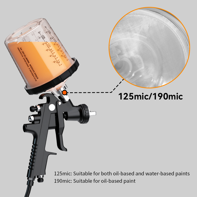 • 優れた塗装仕上げを実現する内蔵フィルター: 使い捨てスプレーカップキャップには、190μ(油性塗料)および125μ(水性塗料)フィルターが内蔵されており、スプレー中に不純物を効果的にろ過し、塗料の光沢を20%向上させます。